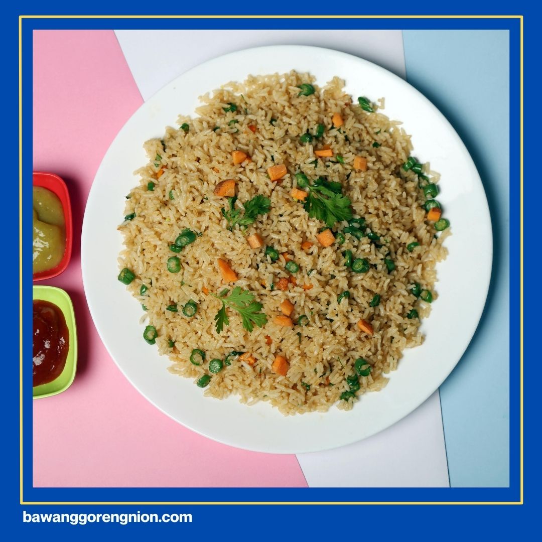 – Masak dengan api besar sebentar agar aroma tumisan bawangnya meresap sempurna ke dalam nasi.