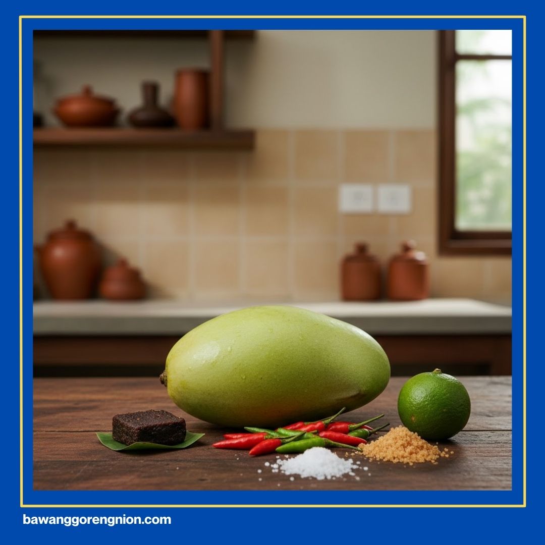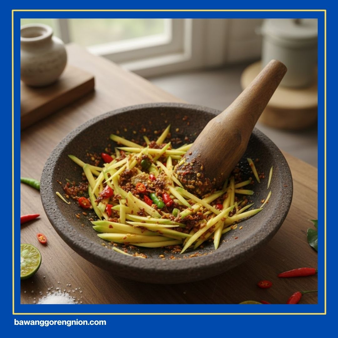 Kakak harus teliti saat memilih buah mangga untuk menu ini. Pilihlah mangga yang dagingnya masih keras saat ditekan jari. Kulitnya harus mulus dan warnanya hijau segar merata sekali. Mangga yang terlalu matang justru bikin tekstur sambal jadi lembek. Rasa asam yang kuat adalah kunci utama kesegaran sambal ini.
