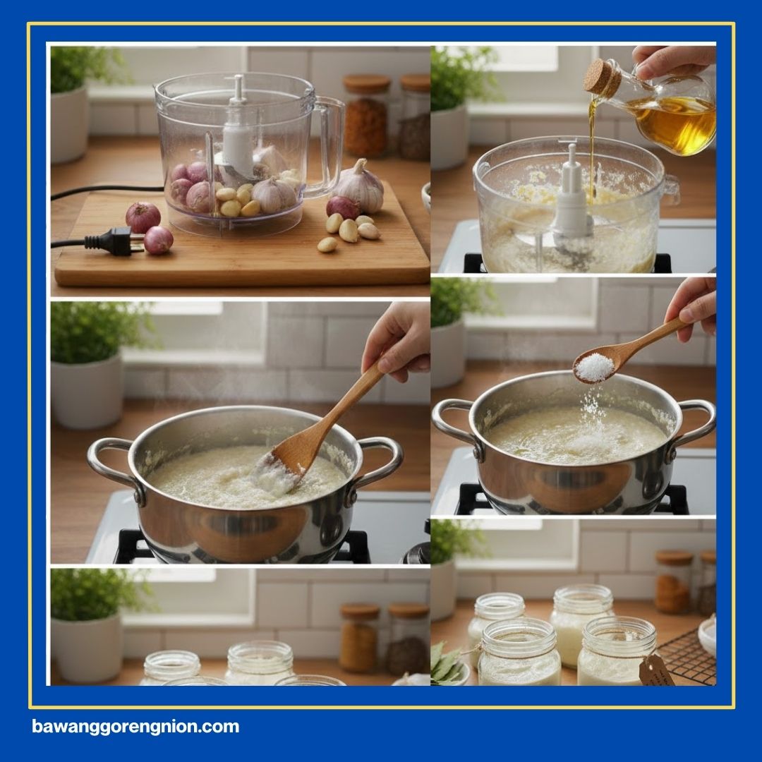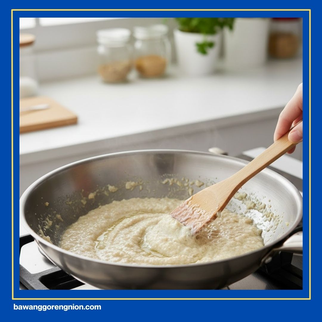 Biarkan bumbu dasar putih tersebut beristirahat sejenak di suhu ruang. Kakak bisa menunggu sampai bumbunya dingin secara alami. Cara ini sangat krusial agar kualitas rasa tetap terjaga. Dapur Kakak pun tetap aman dari aroma bumbu menyengat.