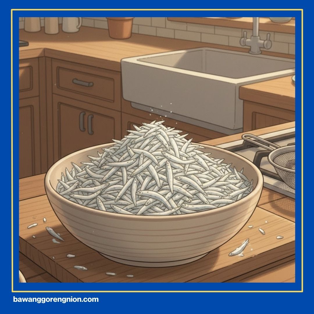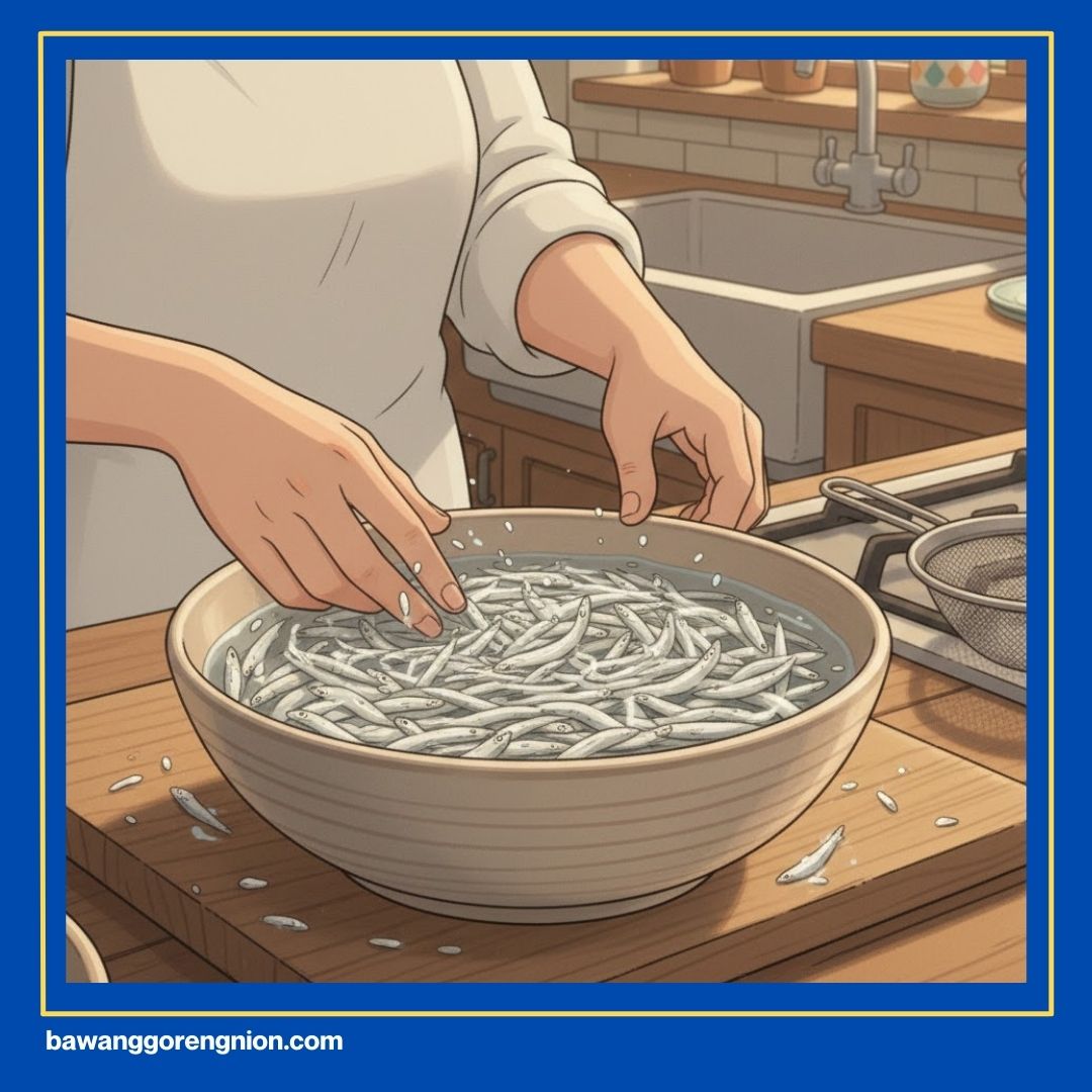 Cuci ikan teri menggunakan air mengalir sampai benar-benar bersih dari kotoran. Kakak bisa merendamnya sebentar saja dengan perasan jeruk nipis agar bau amis menghilang. Langkah ini sangat krusial buat kenyamanan indera penciuman Kakak nanti.