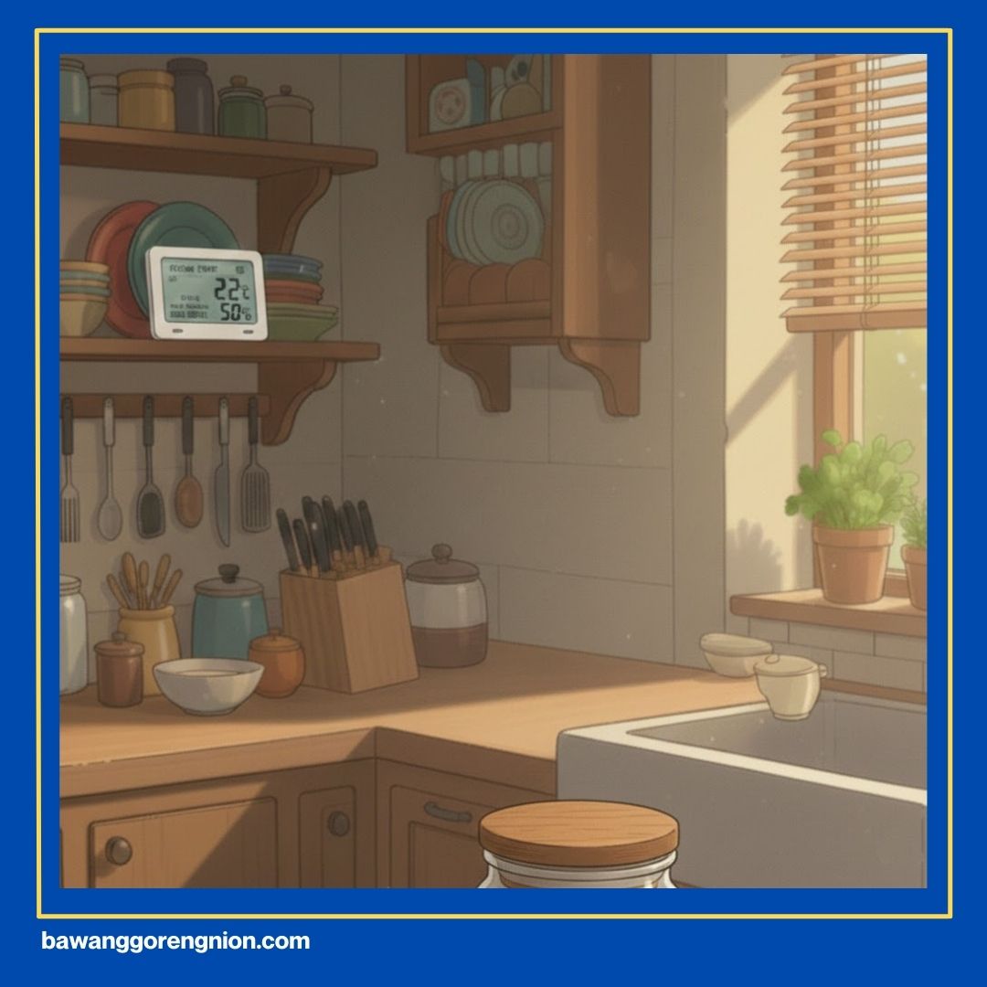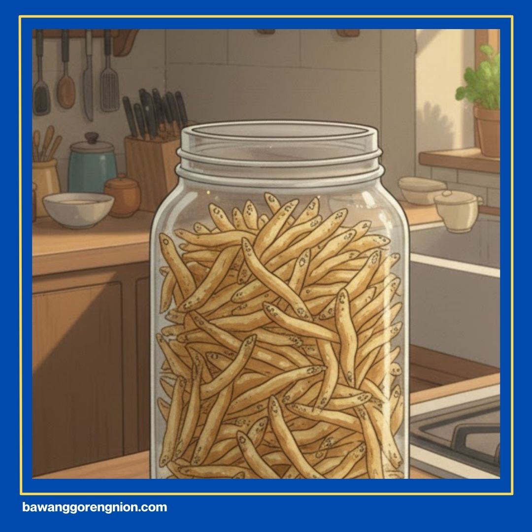 Hindari meletakkan wadah di dekat kompor yang panas karena uapnya bisa merusak tekstur. Kelembapan tinggi adalah musuh utama bagi makanan kering yang krispi seperti ini. Pilihlah lokasi penyimpanan yang kering agar stok lauk tetap enak saat ingin disantap nanti.