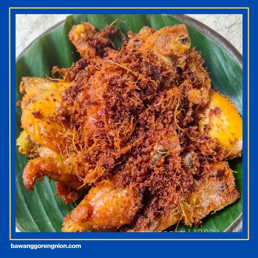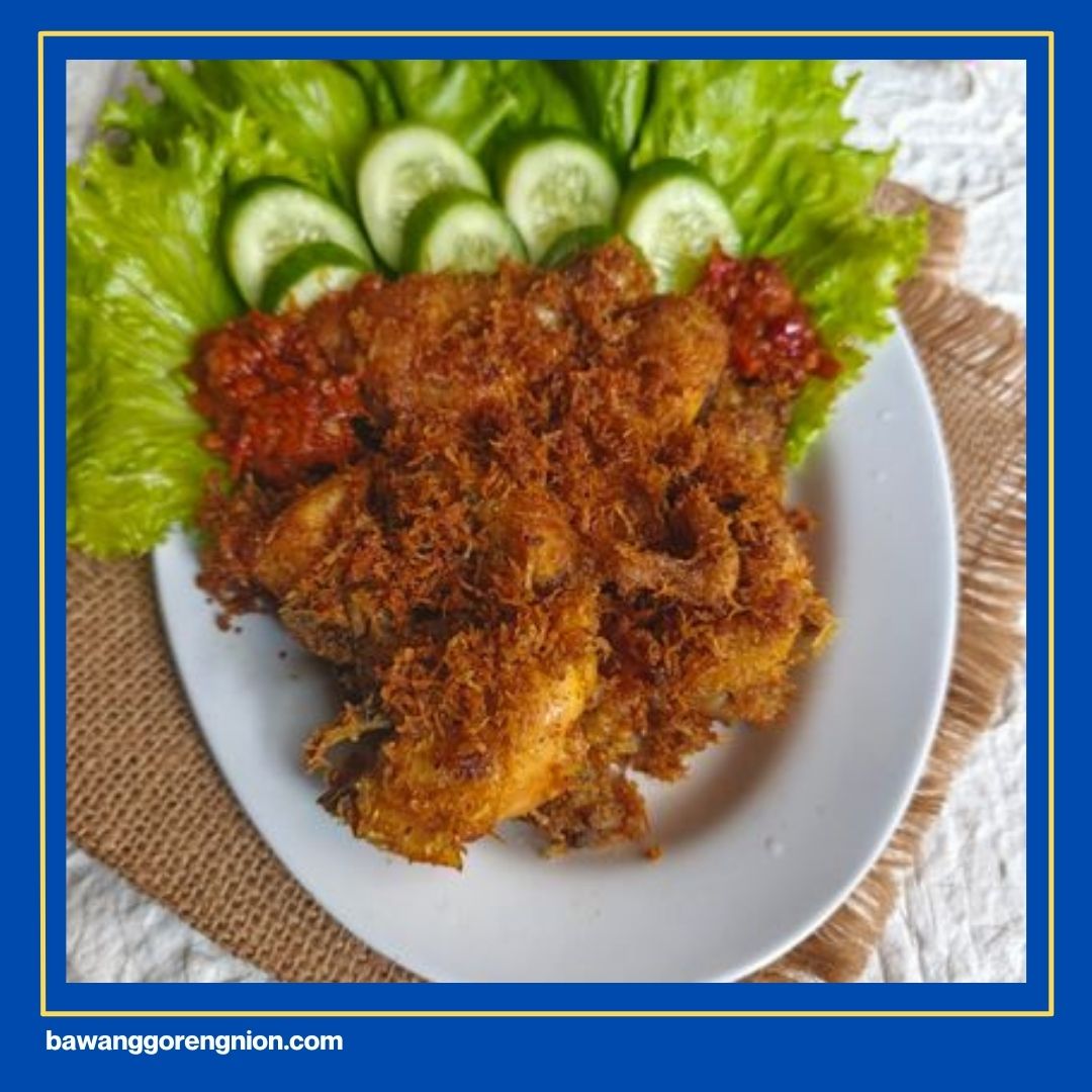 Ayam goreng serundeng menggunakan parutan kelapa berbumbu yang digoreng hingga garing serta sangat wangi aromanya. Serundeng kelapa ini memberikan tekstur renyah yang sangat unik di setiap suapan nasi yang kamu ambil. Rasanya yang gurih manis bikin masakan ayam jadi terasa jauh lebih istimewa.