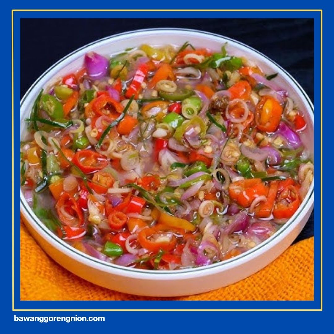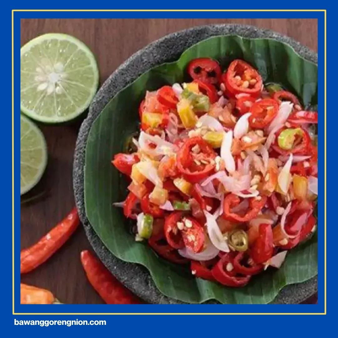 Sambal ini tidak diulek, sehingga tekstur sayurannya tetap segar dan sangat renyah saat digigit. Rasanya yang didominasi rasa asam pedas sangat cocok dipadukan dengan ikan bakar bumbu kuning. Ini adalah pilihan sambal terbaik untuk kamu yang bosan dengan sambal ulek biasa.